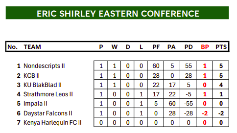 Nondescripts II top the Eric Shirley Eastern Conference after a hard-fought opening round. KCB II follow closely in second place with five points after a 28–0 walkover to stay level on points with the leaders.